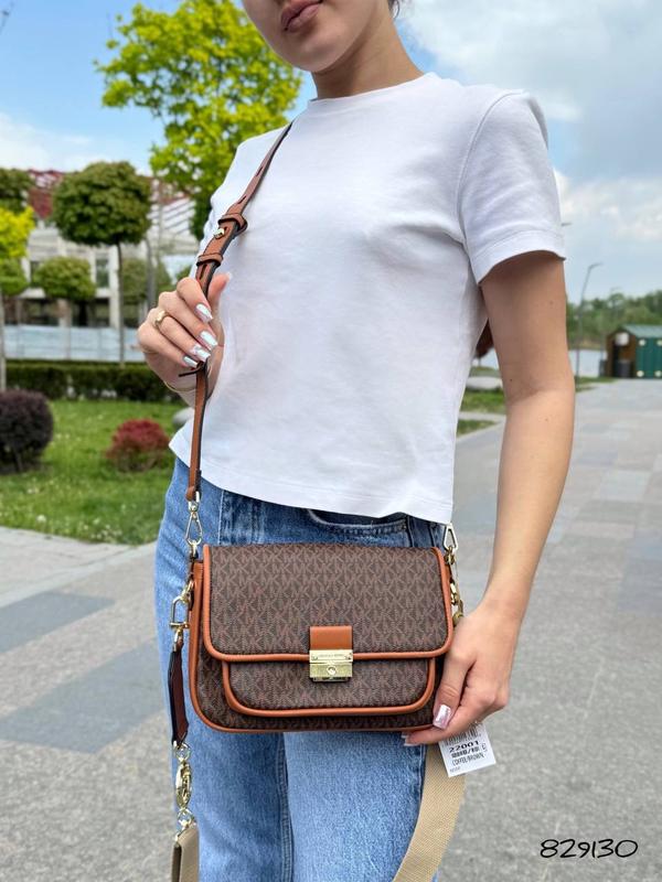 829130 Новинка 👜❤️ Сумка МКорс декор шкіра Матеріал: натуральна шкіра люкс Розмір: 24/14 Колір: шоколад Рімінець регулюється довгий та широкий з декором МКорс лого Форму ідеально тримає