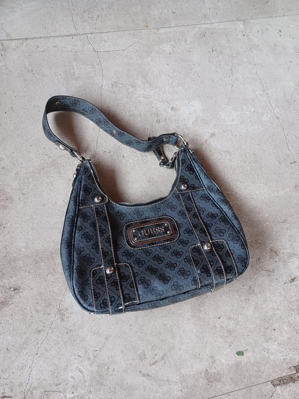 Сумка через плечо Guess изготовлена из глянцевого лакированного материала с культовым узором в виде монограммы бренда. Структурированный силуэт, удобные бретели и металлическая пластина с логотипом Guess спереди. Застежка на молнию, внутренняя подкладка с отделениями. В хорошем состоянии — фурнитура и молния полностью функциональны, в целом аккуратный вид.
