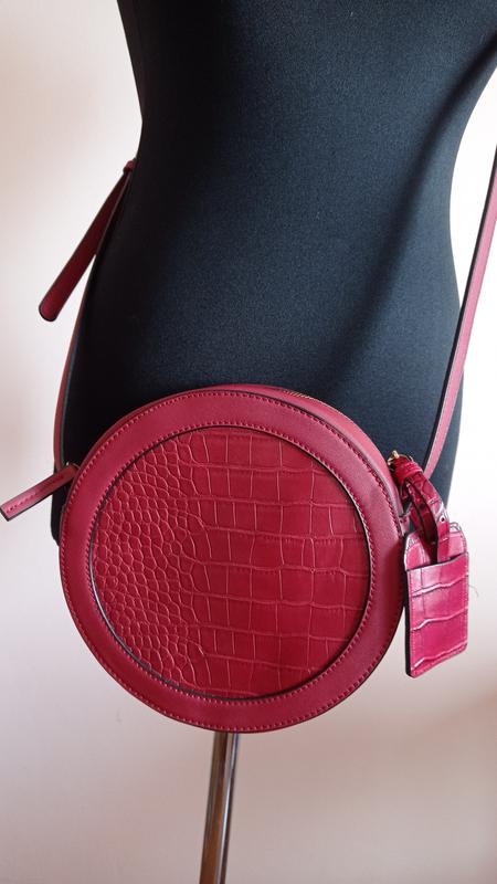 Круглая сумочка, через плечо. Внешний диаметр 20 см. Цвет бордовый, винный Ремень регулируемый, длинный, ширина 1см. Внутри одно отделение и один маленький карманчик. Состояние - новая, без бирки.