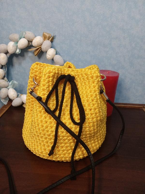 сумочка насыщенного желтого цвета, связана со шнура, маленька но вместительна,меет шнур-затяжку,ремешок тонкий с кожа заменителя,зъемный,120см, по желанию можно добавить подклад(+100грн) высота в произвольном состоянии 18см дно диаметр 17см возможен повтор в другом цвете тік ток,інста ***********