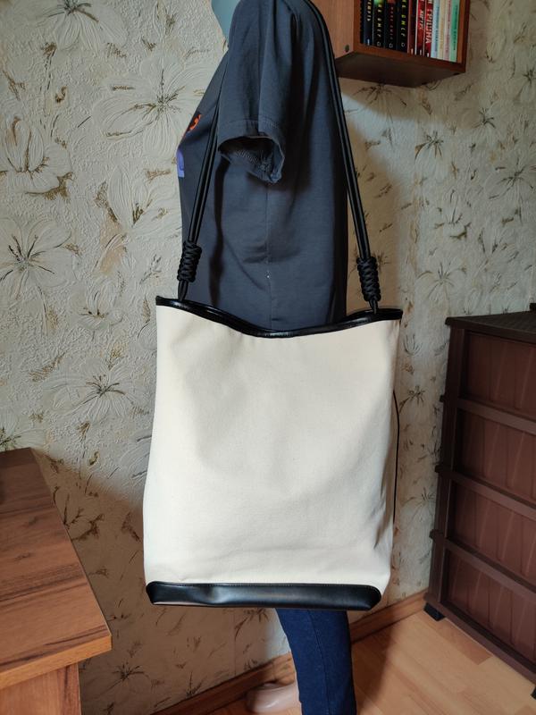Большая, вместительная сумка. Нова. Ручка длинная, длиной 84 см, НЕ регулируется. Материал - плотный текстиль. Вставки - искусственная кожа. Внутри одно большое отделение, а также есть маленькие карманы. Закрывается на кнопку. Цвет молочный. Заміри на фото.