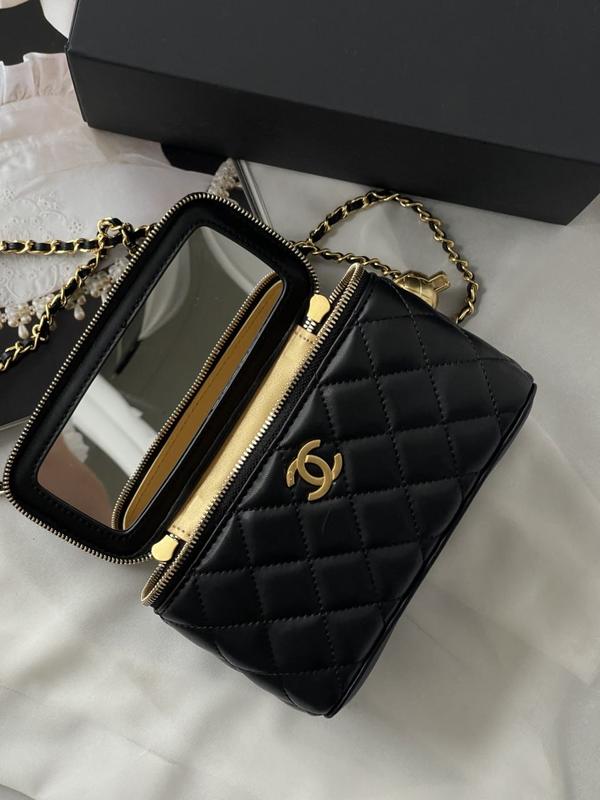 Сумка виготовлена зі шкіри з вираженою зернистою фактурою та оздоблена декоративною строчкою. На дні сумки — фірмовий прошитий логотип. Внутрішня частина виконана зі шкіри золотого кольору, що додає виробу особливого шарму. Усередині — невелике основне відділення, додатковий компактний кишеньковий відсік, зручне зеркальце , брендовані бірки та унікальний код виробу. Для носіння через плече передбачений довгий витончений ланцюжок із вплетеною шкірою. Він не відстібається, але легко регулюється по довжині завдяки оригінальному механізму. Матеріал: шкіра Фурнітура металева з логотипами. Розмір сумки: 18*10,5*8см Плечовий ремінь: 135см регулюється Магнітна коробка, пильовик, папір тішью та буклетики, закріплюється фірмовою лентою.