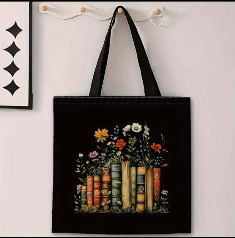 Сумка-тоут с Узором Цветов и Книг, Эстетичная Сумка на Плечо, Легкая Покупательская Сумка