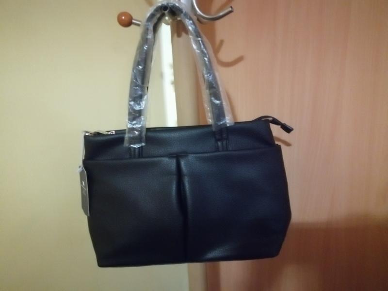 Чорна сумка з екошкіри, нова, дуже класнюча. Добре носиться на плечі. Є лише дві великі ручки висотою 20 см. Також є карабінчики для кріплення довгого ремінця, але самого ремінця немає — якщо у вас є свій, можна використовувати. Розміри сумки: ширина — 36 см, висота — 26 см, ширина дна — 13 см. З одного боку — два великі накладні кишені, з іншого — велика кишеня на кнопці. Усередині — два відділення: з одного боку відкриті кишеньки для дрібниць, з іншого — маленька кишеня на блискавці. Посередині — окремий відсік на блискавці. Якісна фурнітура та стильна підкладка.
