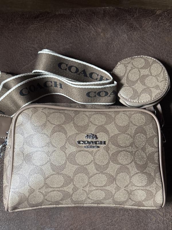 Модна якісна сумка бренду Coach ,світло коричнева ,з двома молніями та довгою текстильною ручкою.