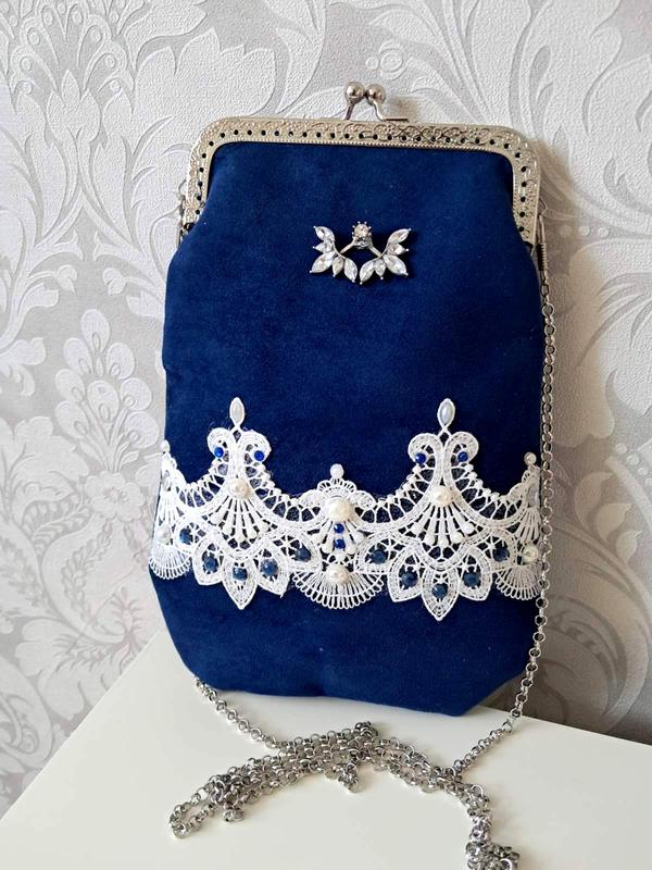 Сумочка выполнена из велюра синего цвета, уплотнена дублином, хорошо держит форму, с фермуаром, на цепочке, украшена вышивкой кружевом и стразами, подкладка атласная. Декорировано ярким украшением.Такий аксессуар любой девушке и женщине придется по вкусу. Стильно, красиво, оригинально! Телефон, парфюм, различные безделушки помещаются в сумочке. Не ищите банальный фабричный подарок!! Ручная работа – в едином экземпляре, ваша женщина будет в восторге! Размер 18*24см.