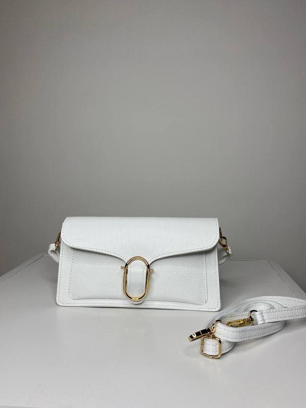 Дуже стильна та практична модель. матеріал: шкіра розміри: 26х8х14 колір: білий фурнітура: золото 2 основних відділення, розділені посередині карманом на змійці. Всередині додатковий боковий карман на змійці. В комплекті 2 ремінці: короткий та довгий (регулюється). Каркасна