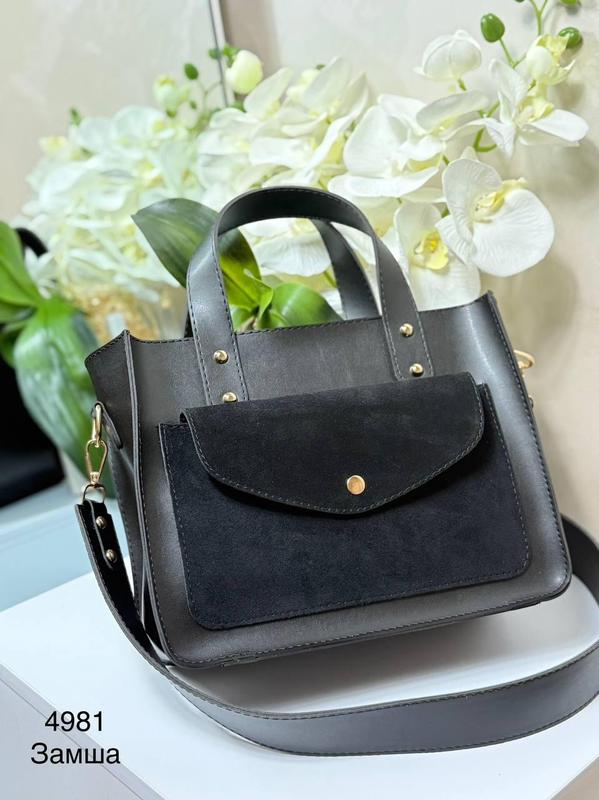 Женская сумка в черном цвете из эко кожи с карманом из замши имеет короткие и длинные ручк...