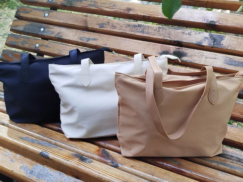тканина сумка на плече, легка, зручна. застібається на блискавку, в наявності - бежева, Дивіться заміри 👇 Матеріал: Нейлонова тканина, водовідштовхувальна Розміри: висота 24 см, ширина 28.5 см. Ширина дна 10.5 см