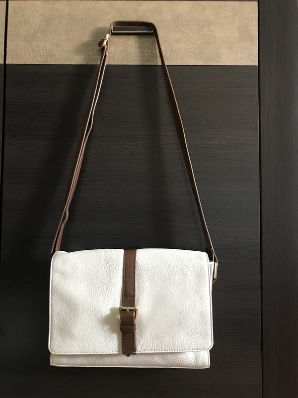 Шкіряна біла сумка Marks & Spencer Сумка із натуральної шкіри Marks & Spencer, шкіра ікра яка стійкіша до подряпин і стирань. Сумка білого кольору, зовсім трошки в беж, тобто приємний колір не вибив око кіпельно білий. Посередині сумочки є декоративний ремінь з пряжкою ( це зараз такий цікавий тренд у багатьох брендах) коричневого кольору. Плечовий ремінь теж коричневого кольору що є практичнішим і не таким марки як білий. Сумочка фабрична, якісно зшита. Всередині має одне велике відділення і три кишеньки, одна з них під замочком Зовні є ще одне велике відділення на магнітній кнопці із внутрішньої сторони, наприклад до швидкого доступу до телефону Ширина 27 Висота 20 Дно 27*4,5 Ручка ширина 2 см, довжина яка хочеш