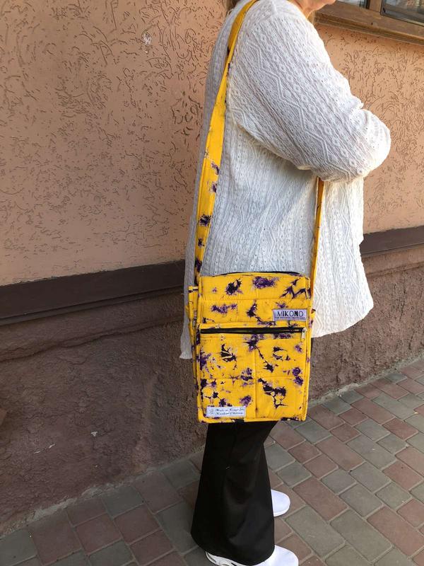 Яркая сумка 23х27х12х132 смз ткани на поролоне.том пухленок.Сверху карман на замке, внутрь тоже.Одное отделение с маленьким карманом.по бокам карманы карманы