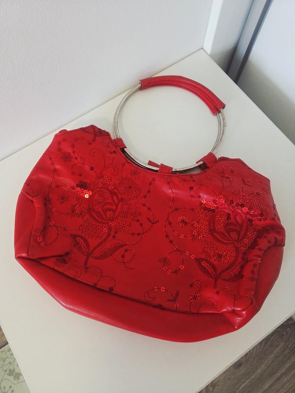 Красная сумка с вышивкой Ширина: 33 см Высота: 21 см Глубина: 8 см Диаметр ручек: 16 см Количество отделений: 2 Материал: искусственная кожа