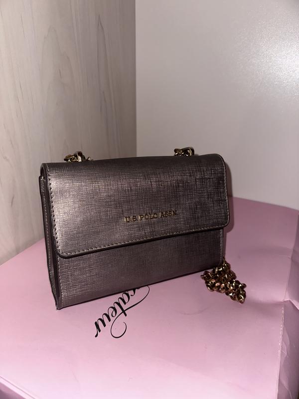 Стильна та компактна сумка від бренду U.S. Polo Assn. — ідеальний аксесуар для щоденних виходів та особливих подій. • Колір: насичений графіт із легким металічним блиском • Матеріал: екошкіра з текстурованою поверхнею • Фурнітура: ланцюжок і застібка золотистого кольору • Розмір: компактна, але містка — легко вміщує телефон, ключі, картки та невелику косметику • Всередині: один основний відділ і кишенька для дрібниць • Стан: відмінний, без дефектів, усередині — чиста • Додатково: зручна кишеня ззаду для швидкого доступу до карток або дрібниц