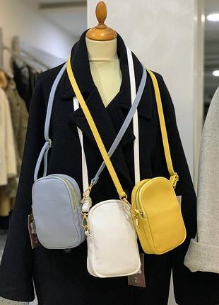 В наявності дуже зручні, літні сумки під телефон. Натуральна зерниста шкіра, 2 відділи. Розміри: 19*13 см, по дну 6 см. Ремінець тоненький 1,5 см з регуляцією розміру. Всередині якісна підкладка та кишеня. Кольори: білий, голубий, лимонний. Виробництво Італії.