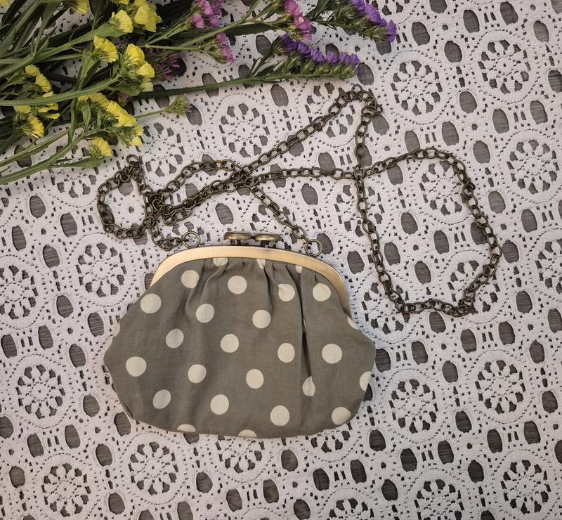Материал: текстиль в серо-оливковом цвете с белым горошком; Застежка: металлическая рамка с фиксатором-"целунком" (kiss-lock clasp); Ручка: цепочка бронзового цвета, позволяющая носить сумочку на плече; Стиль: в стиле "ретро" или "винтаж", идеально подходит для тематических вечеринок, фотосессий или в качестве оригинального аксессуара.