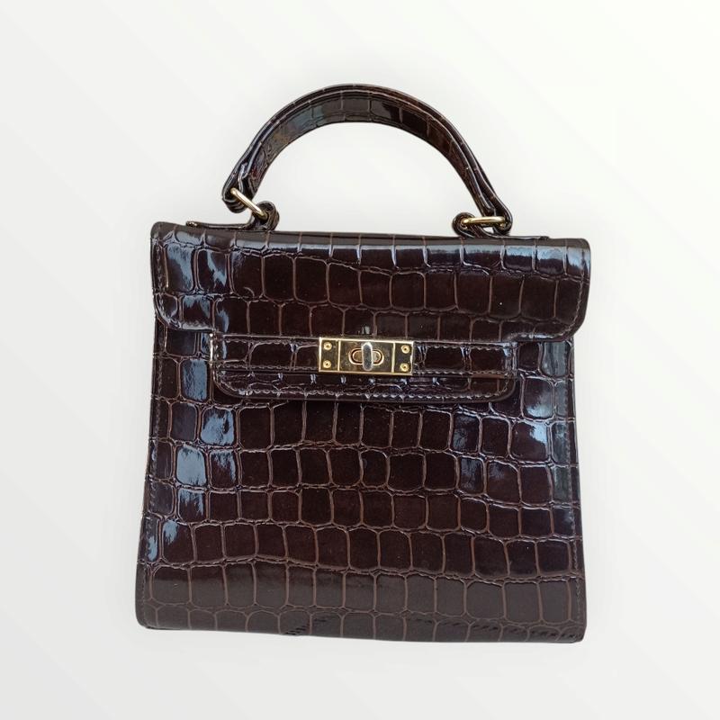 Фирма: Marks and Spenser Внешний материал: искусственная кожа Застежка: замок Состояние: идеальный; без дефектов Сумка имеет 1 отделение и боковой карман на молнии. Фурнитура: золотая, с декоративной застежкой-перекрутой. Этот дизайн очень напоминает Hermès Kelly, но без характерных ремешков и ключика. Размеры: Ширина дна 20 см на 8см, по верху 18см на 5. Высота 18 см.