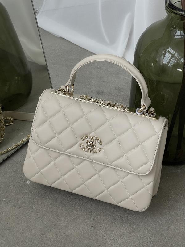 Trendy CC White Lambskin - Premium Сумка виготовлена з гладкої шкіри, прострочена. Всередині три відділення, одне з яких має додатково кишеню на близкавці. Також є кишеня позаду сумки відкрита. Підкладка шкіри в бордовому кольорі, має тистення логотипу та код в середині. Зачиняється відділення на фірмовому механізмі (у логотипі). На самій сумочці зверху масивний логотип з вплетеною шкірою. Якісна фурнітура, металева та брендована. Ланцюжок з вплетеною шкірою для носіння через плече має фіксовану довжину, ручка шкіряна. Матеріал: шкіра Фурнітура металева з логотипами. Розмір сумки: 26*19*9см Плечовий ремінь: максимально 108см не регулюється. Ручка : висота 10см ⭐️ Магнітна брендова коробка, пильовик та буклети в комплекті. код: чорний 20244-1 молочний 20244-2