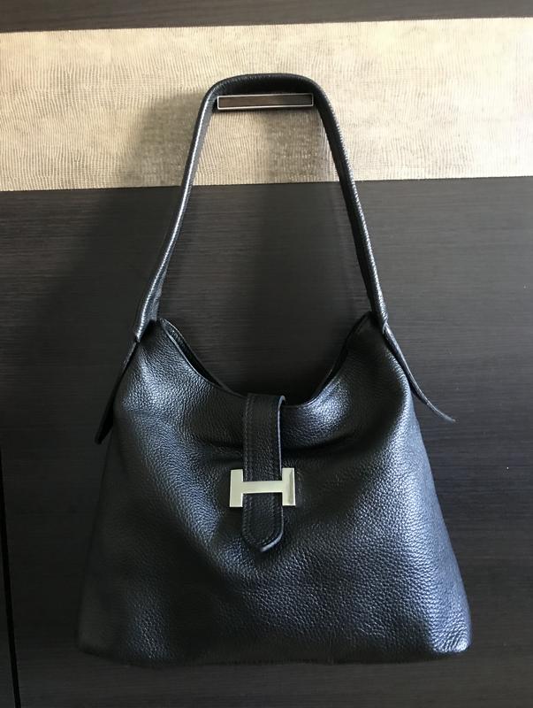 Шкіряна сумка Hermes Сумка Hermes, з натуральної шкіри, шкіра ікра яка не боїться подряпин, сумка чорного кольору із срібною фурнітурою, підкладка чорна, є три відділення: два великих з боків і трете менше посередині під замочком, збоку ще одна кишенька під замочком, на дні сумки є чотири срібні ніжки які захищають дно від подряпин і бруду, зручна широка ручка на плече яка сяде і на верхній одяг, якісна гарна вмістка сумка