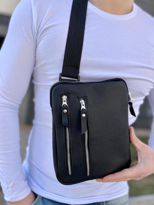 Материал: натуральная кожа Регулируемый плечевой ремешок Застежка-молния 4 внешних кармана на замке 1 дополнительный внутренний карман Компактный размер 24х19 см