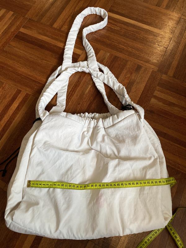 Дуже велика, на стяжках, всередині одне велике відділення і два маленькі на змійці і для телефону. Дві довгі ручки, одна дуже довга. Нюансів одна рожева пляма від фруктів.