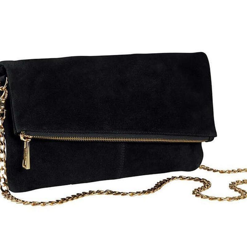 Клатч - німецький бренд Esmara. Красива чорна замшева: 100% натуральна щільна шкіра зовні та у середині. Додається коротка я ручка (петелька) та довга ручка-ціпок. Клапан з магнітною застібкою. Розміри: висота 16см, в повному обсязі 27см, довжина 29 см. з середини кишеня та 2 відділення для телефону та дрібничок.