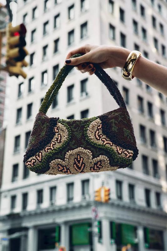 Сумка на плечо с отделкой из бисера и тканью на корпусе. Внутренний карман и застежка-молния. Высота x Ширина x Глубина: 13 x 26 x 5 см