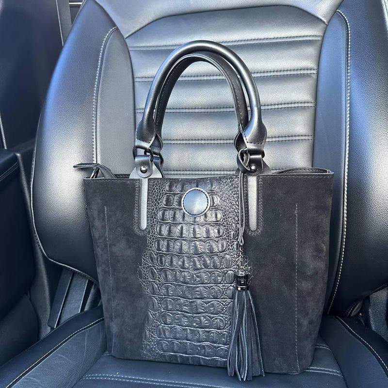 Якісна жіноча замшева сумка рептилія з віночком брелком Характеристики: Матеріал: натуральна замша + екошкіра; Довжина: низ - 27 см, верх - 34 см; Ширина на основі: 12 см; Висота: 24 см; Плечовий ремінь на карабінах входить у комплект (можна носити як у руках за ручки, так і на плечі)