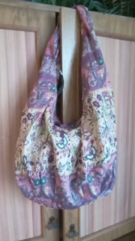 Сумка из ткани. Интересная форма колыбельки. На змейке. Подкладка и небольшой карманчик внутри на змейке. Выс. 30, шир. 40 см. Есть овальное дно. Приятная, мягкая. Ткань цветная, с серебристыми точечками.