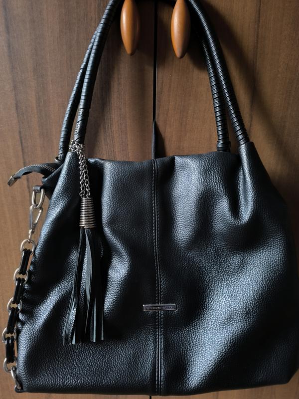 Сумка женская, вместительная, в красивом состоянии. Размеры высота 27 см, с ручками 44 см, ширина 32 см, глубина 12 см. Снаружи на задней стороне-карман, внутри-разделенный карманом на застежке, также есть маленький карман на застежке внутри на задней стороне, и два маленьких кармашка на передней. Из недостатков-на ручках сдвинуться накручивание