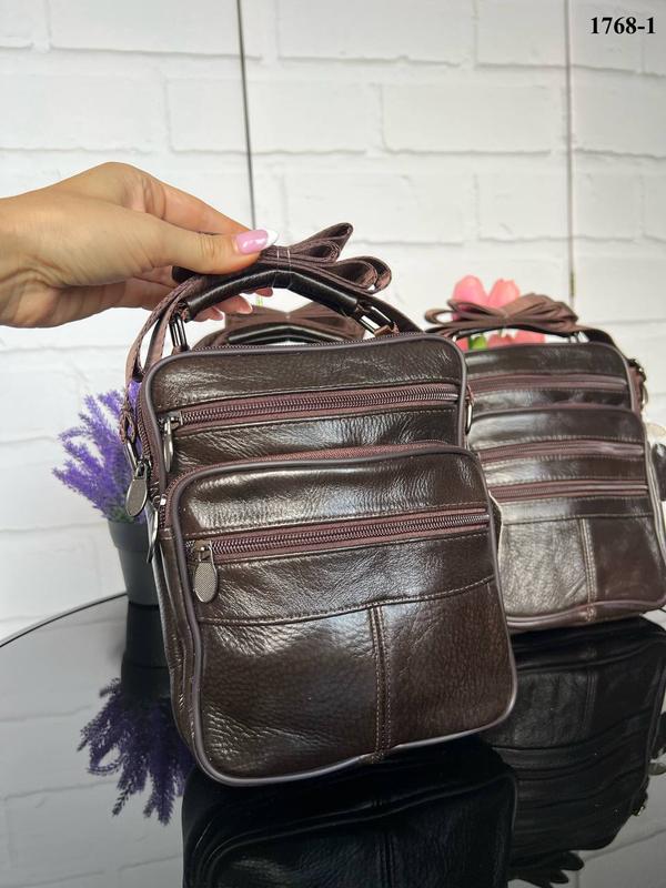 ЗАМЛЛЕНИЕ С ОПЛАТОЮ ПРИ ДОСТАВЦЕ ТОЛЬКО НОВОЙ ПОШТОЙ УТОЧНЯЙТЕ НА ВСЯК СРЕДСТВО НАЯВНОСТЬ Натуральная кожа 23х19х9 см. Одно отделение на молнии, в середине карман на молнии. Спереди 3 или 4 (в зависимости от модели) кармана на молнии. Сзади карман на молнии. Максимальная длина ремня 140 см. Код 1768