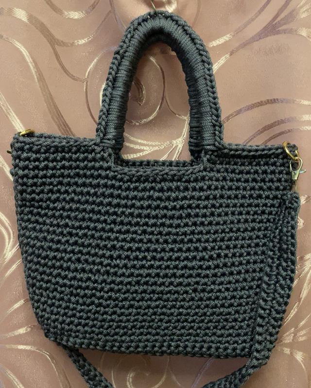 👜 Сумка гачком, сіра — ручна робота з міцного шнура. 📏 Дно 22×8 см, висота 22 см, ручка 25 см. 🔗 Довга ручка на карабінах — 200 грн, продається окремо.