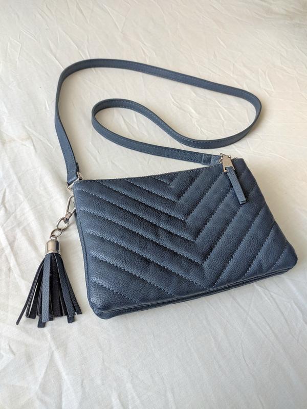 Женская кожаная синяя мини сумочка на 2 отделения на молнии. Размер 14х21 см. Ремешок 120 см.