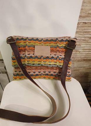 яскрава сумочка ручної роботи з Південної Африки з натуральної шкіри на довгому регулюємому ремінцеві, зшита з різнокольорових перфорованих куточків шкіри в два наслоєння.,тому має плотну структуру. Як зовні, так і з середини однакова шкіра, без підкладки, закривається клапаном на магніті. Розмір висота 20см, ширина 26см
