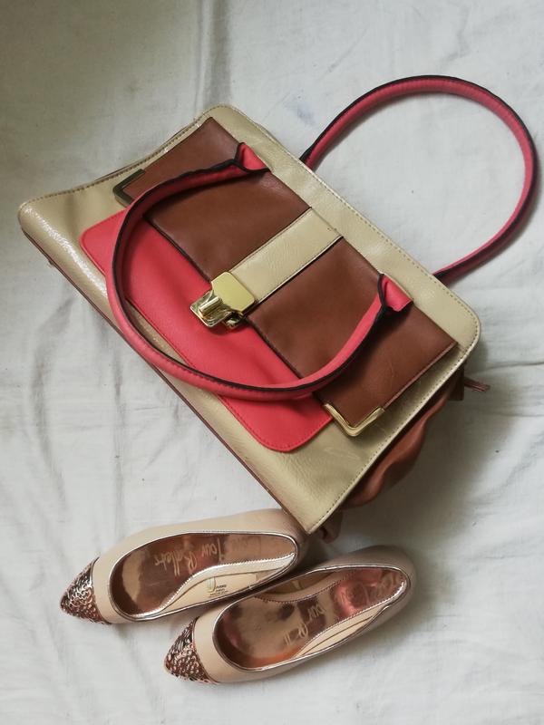 Вмістка сумка А-4. Довжина 35 см висота 25 см глубина 11 см. Довжина ручок 54 см. 2 Відділення. Нюанс-в середині кишені відбився слід від паперової обгортки ( останне фото)