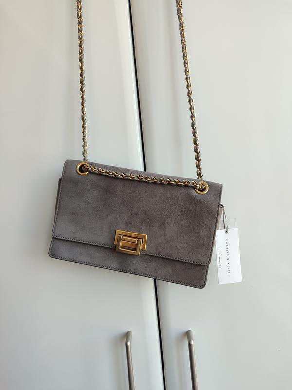 Новая, оригинальная сумка Charles & Keith, ни разу не была в использовании. Описание: Цвет: серый (эффект замши) Фурнитура: золотистая Размеры: Высота: 15 см Ширина: 24 см Ширина дна: 5 см Застежка: поворотный замок Особенности: Плечевой ремешок-цепочка Внутри есть несколько отделений, в том числе один на молнии и кармашки для карточек. Идеально подойдет для вечернего выхода или как элегантный аксессуар на каждый день.