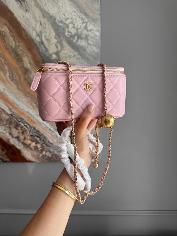 Mini Vanity Case in Light Pink Lambskin with Gold-Tone Hardware and Ball Charm Chain Арт. 3890 • Матеріал : шкіра • Розмір : 17х10х8 • Один основний відділ • Комплект : брендова коробка, пильник, документи
