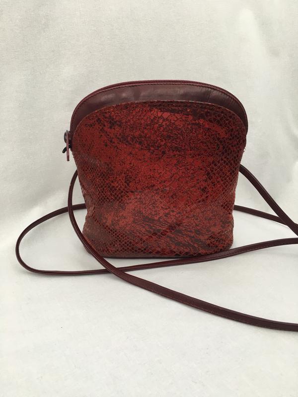 Маленька бордова шкіряна сумка, крос-боді, Індія Висота 19см, ширина 18см, ширина низу 6см, ремінець не регулюєтся, по переду застібка кнопка, основне відділення на блискавці, внутрішній карман на блискавці, задній карман блискавка. По переду принт під зміїну шкіру.