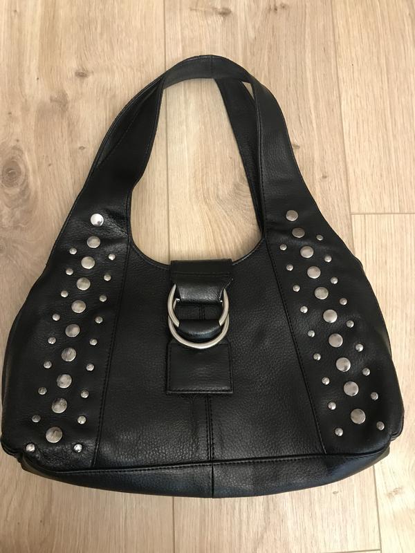 Шкіряна сумка, бренд. Tommi &kate. Колір чорний. Не важка . Має два відділення та два внутрішніх кармана на молніі. Розмір 32*20см,дно 32*8см,загальна довжина ручок 50см. Стан гарний. Відправлю по передоплаті або безпечною оплатою.