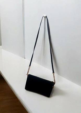 Колір і матеріал: Чорна, ймовірно, зі шкіри або якісного шкірозамінника. Форма: Прямокутна, пласка, компактна. Ремінець: Тонкий, регульований, призначений для носіння сумки через плече або на плечі. Частина ремінця, ближче до сумки, може мати декоративні елементи, наприклад, ланцюжок золотистого кольору. Фурнітура: Металеві деталі (блискавка, кріплення ремінця) золотистого кольору. дзвіниця Призначення: Стильний та універсальний аксесуар, що підходить для повсякденного використання або для особливих випадків. Заміри, висота 22,ширина 30 1 відділення Оплата на карту приват, відправка будь якою поштою впродовж трьох днів