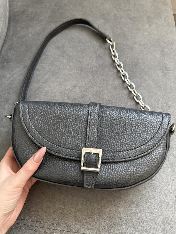 Жіноча вмістка сумочка чорного кольору. Є дефект на фото (трішки ржавчини на пряжці і ланцюжку)