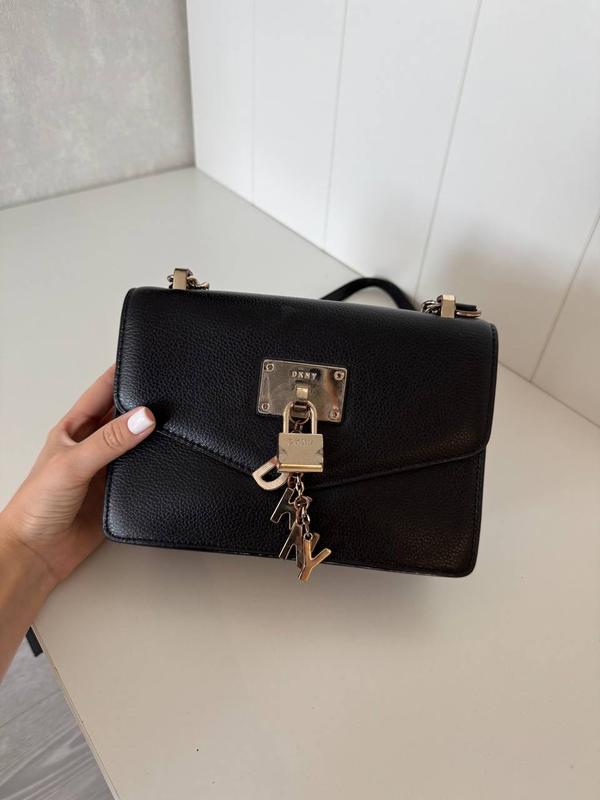 Сумка DKNY чорного кольору з фактурної шкіри. Має металевий замок із підвісками та ланцюжковий ремінець через плече. Стильний та універсальний аксесуар для будь-якого образу.