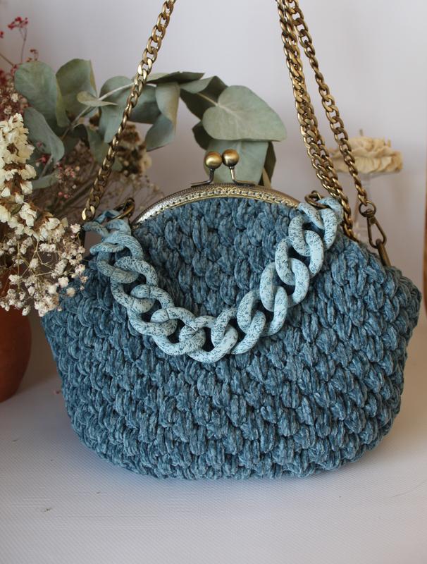 Сумка на фермуаре с застежкой "поцелуй", ручная работа. Сумка выполнена из вельветового шнура AVE серо-бирюзового цвета. Качественная металлическая фурнитура, дополнительно акриловая цепь. Размеры по дну 25*18, высота 20см., длина цепи 120см.