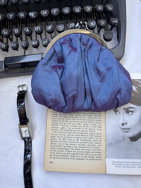 Елегантна вечірня сумочка-клатч -350📮 з ефектом хамелеона, що переливається від фіолетового до синього. Виготовлена з блискучої тканини (можливо, атлас або шовк) з м'якими складками. Має класичну застібку-поцілунок та металевий ланцюжок темного кольору. Підкладка яскраво-синя з дамаським візерунком. Ідеальний аксесуар для особливих подій.