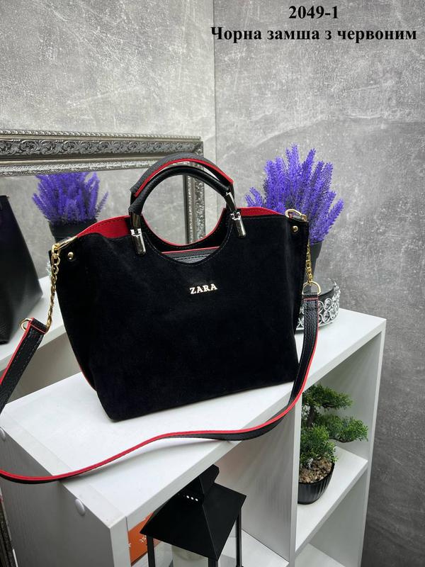 Женская стильная и качественная сумка из натуральной замши и эко кожи черная с красным
