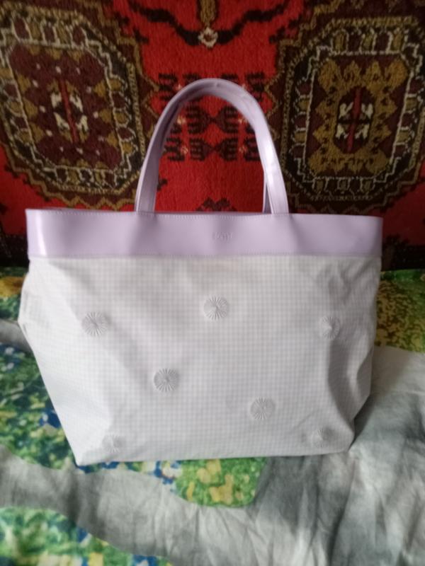 Женская сумка, из высококачественного полиуретана и полиэстра, с двумя ручками. На одно отделение. Размеры:сота 33см, длина 50см, дно сумки:36см ×16см, длина ручек 38см. Б/у в очень красивом состоянии, есть маленький дефект (постоянная фото) небольшая потертость угла сумки с низа