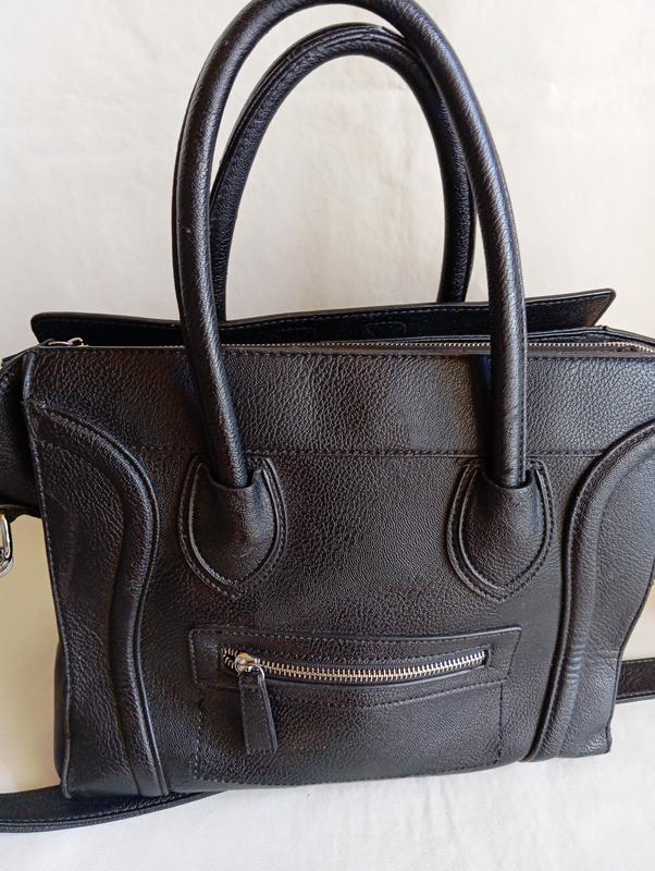 Сумка черная, два отделения кармашки на молнии, одно большое, размер высота 26, дно 31, ширина верха 44, ручки 48, есть потертости на боковых низах,фото