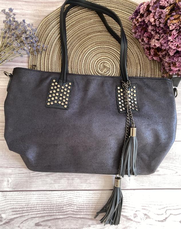 ✨ Стильна жіноча сумка ✨ ▫️Стан: б/у, але як нова– без дефектів. ▫️Колір: темно-синій з легким блиском. ▫️Декор: металеві заклепки та стильні підвіски з китицями. ▫️Фурнітура: міцна, у відмінному стані. ▫️Розміри: середня(зручно вміщає документи, планшет чи інші необхідні речі). ▫️Ручки: зручні подвійні довгі ручки для носіння на плечі чи в руці. ▫️Підійде для щоденного використання та під будь-який образ. ▫️Практична та водночас стильна.