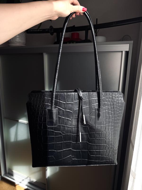 Містка, елегантна сумка з анімалістичним тисненням 🖤 Має 2 основні відділення на змійці та кілька маленьких всередині. Заміри: Висота - 30 см Ширина - 35 см Глибина - 9 см Довжина ручок - 64 см (від місця кріплення - 73 см) Не вміщає формат А4