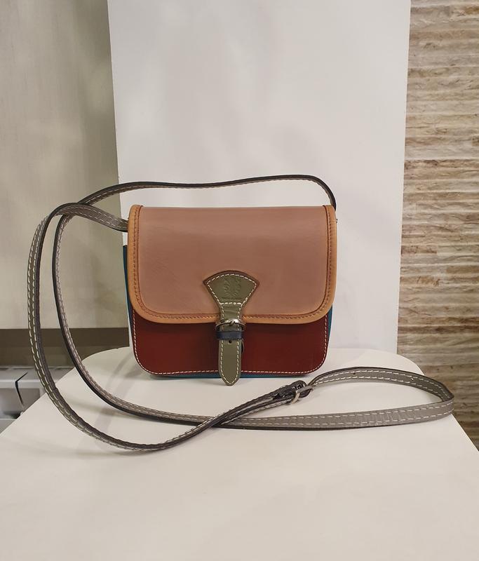 маленькая разноцветная яркая сумочка из натуральной кожи итальянского производства. Полностью кожаная, без подкладки на длинном регулируемом ремешке. Имеет два отделения и внутренний карман, закрывается клапаном на магнит. Размер высота 15см, ширина 17см, дно стороны шириной 7см.