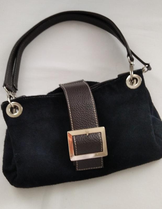 Сумочка женская темно синего цвета в сочетании с коричневым.Выполнена из натуральной замши и кожи. Размер сумки длин 29см,высота 17см,ширина 12см, длина ручек 55